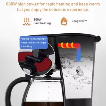 Cafetera eléctrica de 1.25L con capacidad para 10-12 tazas, potencia de 800W y sistema antigoteo. Ideal para hogares y oficinas que disfrutan del café recién hecho en minutos.