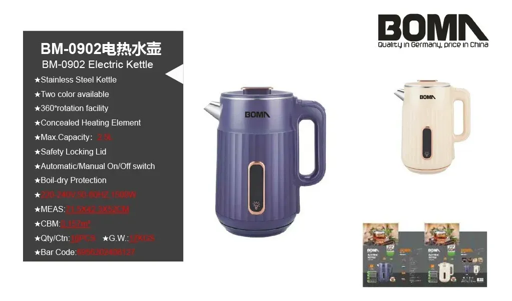 El BM-0902 es un hervidor con capacidad de 2.5 litros, ideal para preparar bebidas calientes para varias personas. Su potencia de 1500W asegura rapidez y eficiencia.