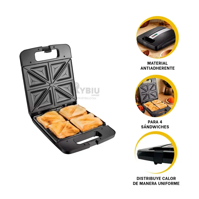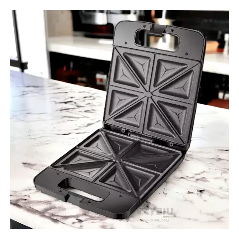 Sandwichera eléctrica de 1400W con capacidad para 4 panes (8 triángulos), placas antiadherentes y diseño compacto para un tostado rápido y uniforme.