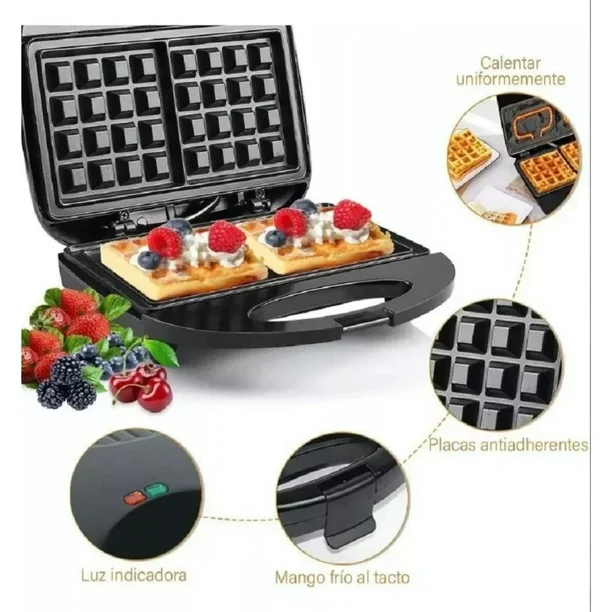 Sus placas antiadherentes evitan que la mezcla se adhiera, facilitando tanto la cocción como la limpieza. Además, cuenta con luces indicadoras de encendido y listo para usar, lo que asegura un control preciso durante la preparación.
